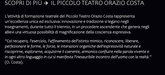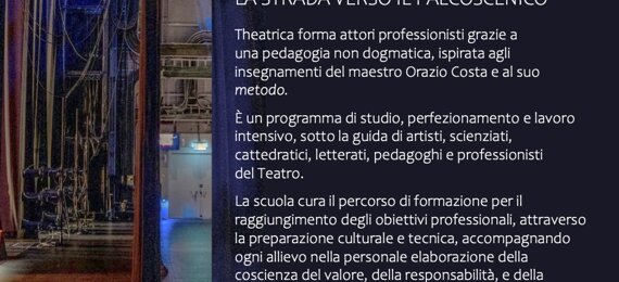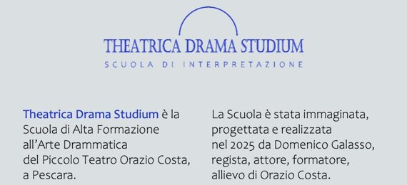 THEATRICA DRAMA STUDIUM è la Scuola di Alta Formazione all’Arte Drammatica del PICCOLO TEATRO ORAZIO COSTA a Pescara. Fondata nel 2025 da Domenico Galasso, allievo di Orazio Costa, educa le sensibilità e allena i corpi e le voci degli allievi attori, tra antichi saperi e nuovi orizzonti
